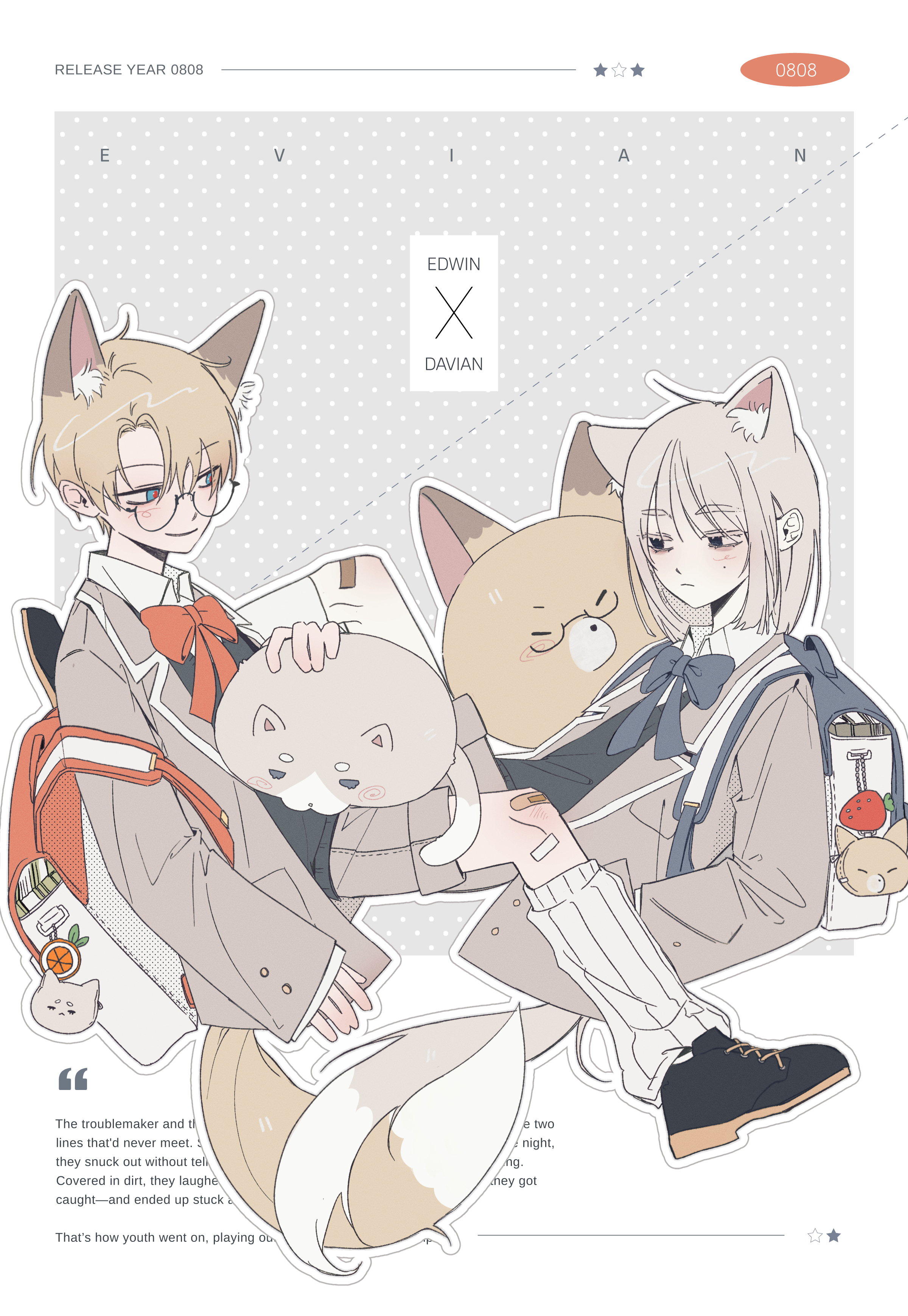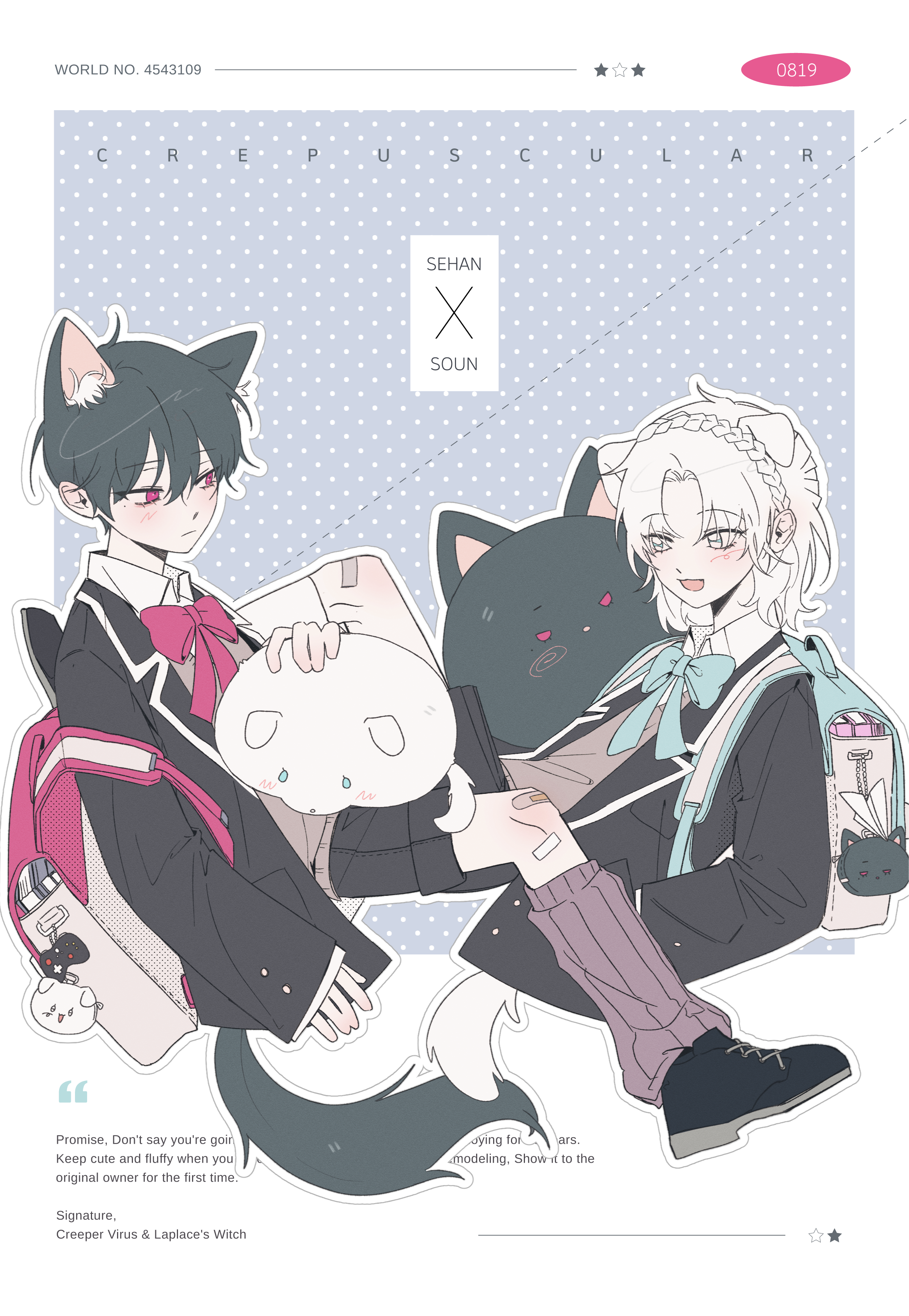 - 캐릭터 이름 (한 단어씩) / 페어 이름 / 상단 짧은 문구 / 4글자 숫자 / 하단 글귀 (6줄로 끊어지는 짧은 문장으로 기재해주세요.)